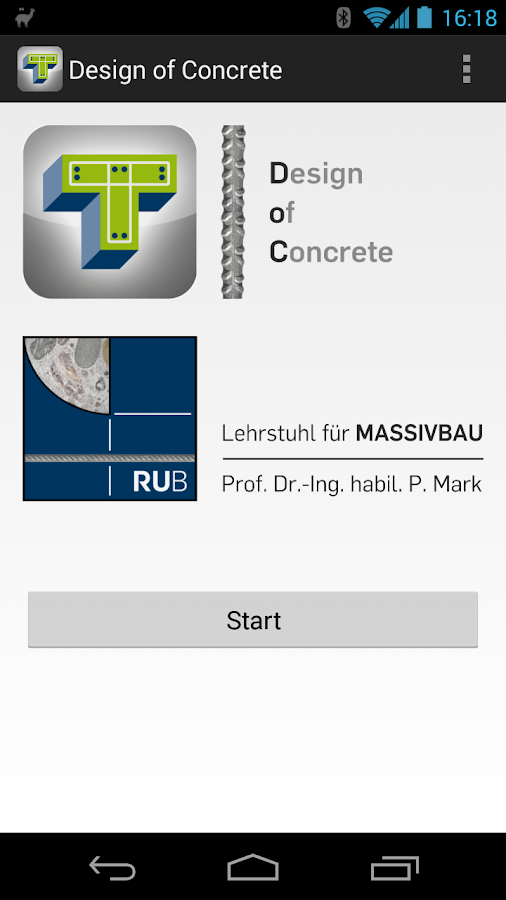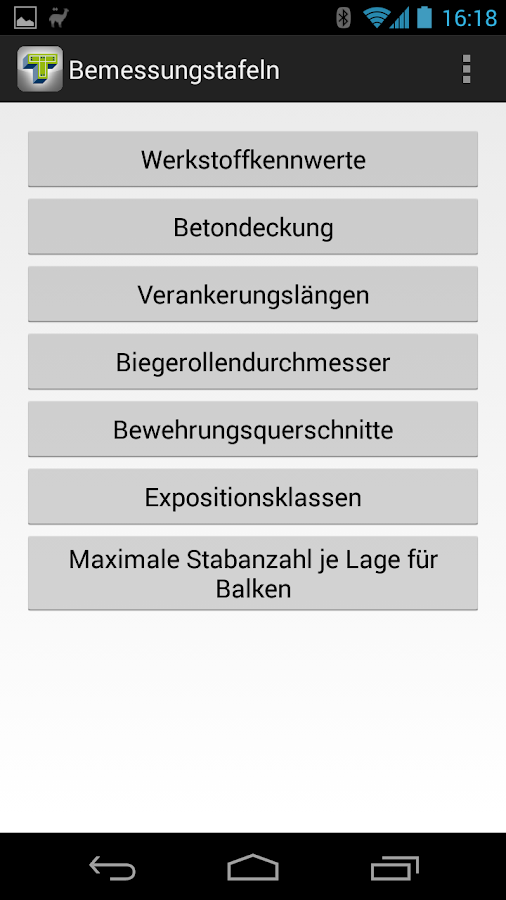 Todos os registros são mantidos em conformidade com as normas vigentes DIN EN 1992-1-1 com anexo nacional (NAD). Além disso, uma calculadora de tamanho médio para um feixe de dois e extensão é integrado. A principal atenção foi dada à aplicação móvel e intuitiva. Por esta razão, a informação de entrada e de saída é reduzida a informação essencial. A aplicação também pode ser utilizada como uma mesa de trabalho móvel para as bases típicas.